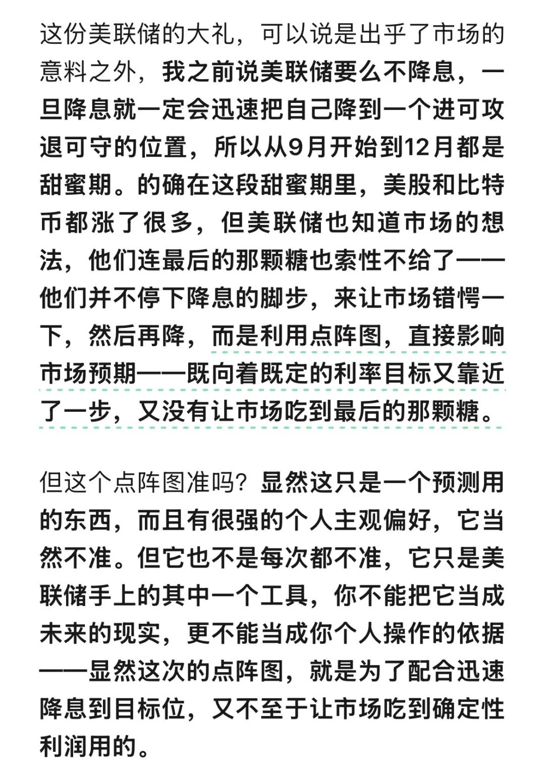 12月的大跌,是由於美聯儲官員的點陣圖調整導致的,但這個點陣圖是不作準的,它説3.9%你就以為真的只降息到3.9%?它只是不想讓你吃確定性的降息利潤罷了。這不1月份CPI數據一公佈,大家又樂觀起來,所以我説點陣圖必定會繼續下探,不信看一季度的結果。但你等人家都公佈完了,再去做反應還來得及嗎?投資是預測的智慧,是預測,而不是根據現有的公開信息去得出人人都能得出的結論——這跟經濟學家有什麼區別呢?