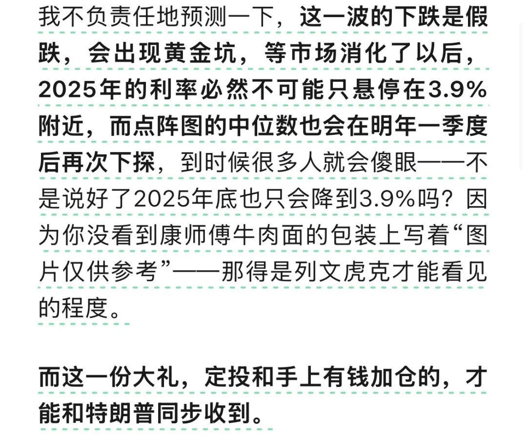 12月的大跌,是由於美聯儲官員的點陣圖調整導致的,但這個點陣圖是不作準的,它説3.9%你就以為真的只降息到3.9%?它只是不想讓你吃確定性的降息利潤罷了。這不1月份CPI數據一公佈,大家又樂觀起來,所以我説點陣圖必定會繼續下探,不信看一季度的結果。但你等人家都公佈完了,再去做反應還來得及嗎?投資是預測的智慧,是預測,而不是根據現有的公開信息去得出人人都能得出的結論——這跟經濟學家有什麼區別呢?