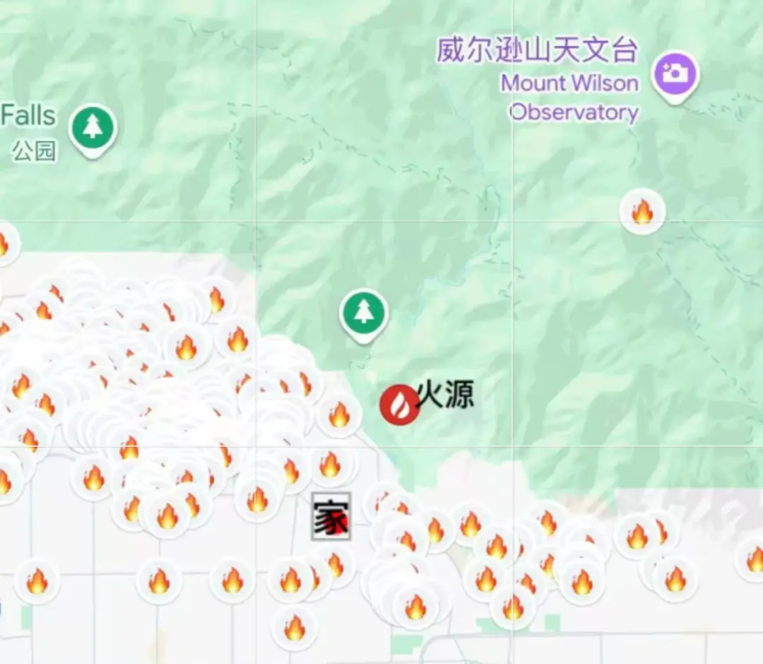 2025年1月7日18時47分,一位鄰居敲響房門,焦急地提醒克萊爾夫婦快離開。丈夫Jing立即到院子裏觀望,空氣中瀰漫着焦糊味,體感温度比平常高了5℃左右。“(附近的)整座山都是紅的,呼呼的火焰從對面的房子衝出來。那個場景太嚇人了。”