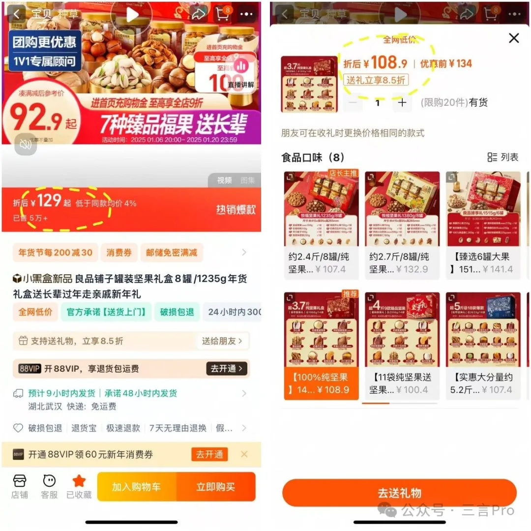 以堅果禮盒為例,正常購物價129元,通過送禮會8.5折優惠到108元,用户直接能夠看到價格變化,不需要計算,直觀醒目。