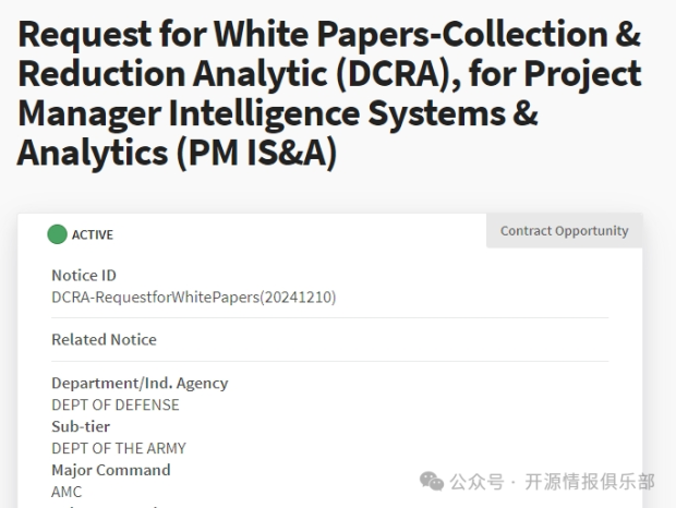 2025年1月8日,美國陸軍承包司令部-阿伯丁試驗場(ACC-APG)代表情報系統與分析項目經理(PM IS&A)發佈了數據收集和還原分析(DCRA)原型項目白皮書的請求。回覆截止日期為1月22日東部時間下午3:00。
