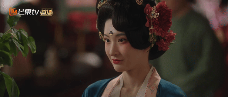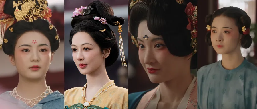《國色芳華》中的唐妝也大有來頭。何惟芳出嫁前梳少女雙髻,頭戴葫蘆形狀髮飾,顯得活潑可愛、天真爛漫;出嫁後則常梳高髻,如墮馬髻等,搭配華麗的黃金頭飾和珠花翠飾,盡顯貴氣。而縣主李幼貞的髮型類似於回鶻髻,中間用紅色牡丹裝飾,兩邊有金色簪子,凸顯其高貴血統。基本上,唐妝都追求白皙啞光的質感,眼影多采用紅、棕等暖色調,暈染出層次感分明的效果。腮紅輕掃於臉頰兩側,增添好氣色與嬌羞感,與眼妝和唇妝的色彩相呼應,使整個妝容色彩協調統一。