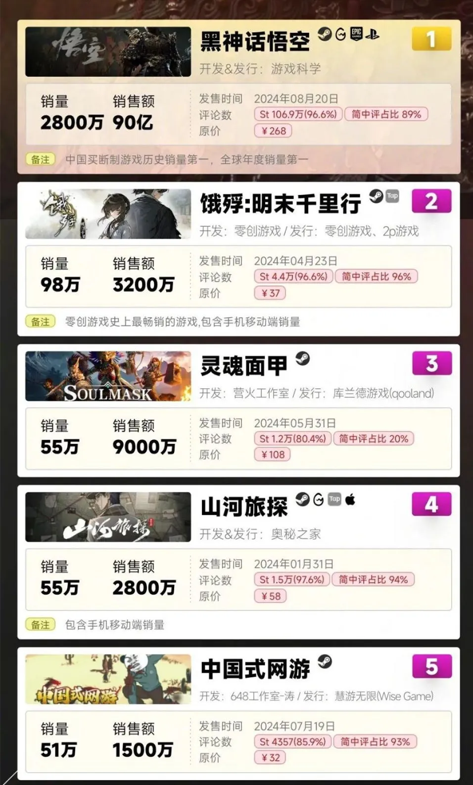 前段時間,微博@國遊銷量榜發佈了2024年度國遊銷量年榜。《黑神話:悟空》毫無懸念地奪得第一,把整個國內買斷遊戲的市場規模提升了398.5%。然而拋開《黑神話:悟空》,排在前20的大多是中小團隊的獨立遊戲,它們無論是銷量還是銷售額相比2023年都出現了下滑。