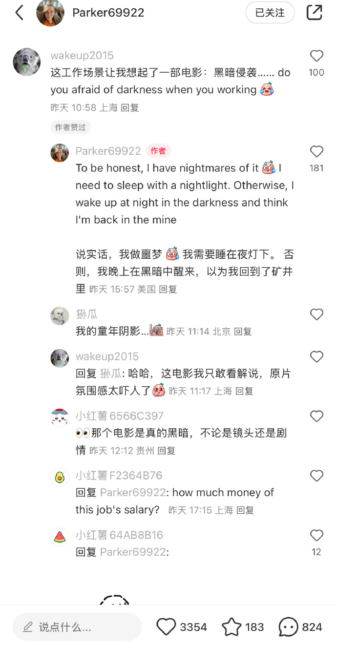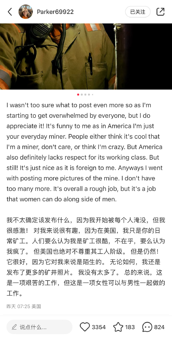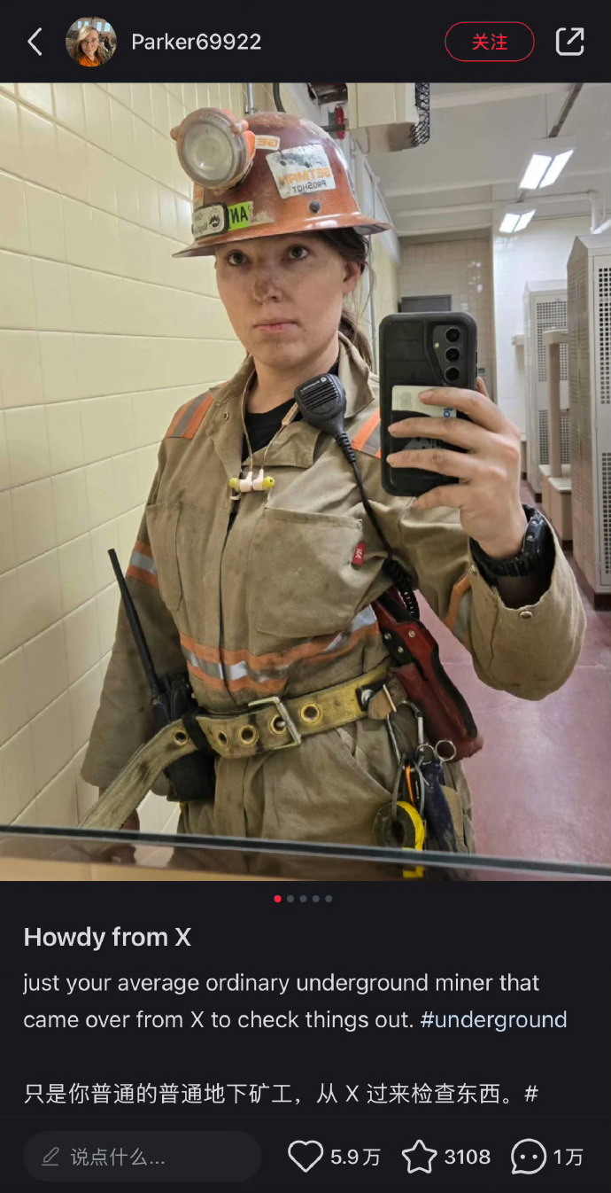 🔹“我覺得這很有趣,因為在美國,我只是一個普通的礦工。人們要麼覺得我是礦工很酷,要麼不在乎,要麼覺得我瘋了。但美國也絕對缺乏對工人階級的尊重。還是那句話:對我來説,這很好,因為它充滿未知的挑戰。不管怎樣,我還是想多貼一些礦井的照片。我沒有太多照片了。總的來説,這是份辛苦的工作,但這是一份女人可以和男人一起做的工作。”