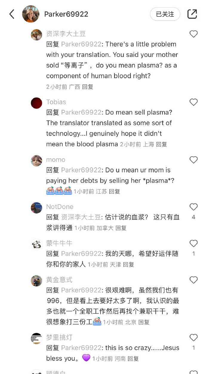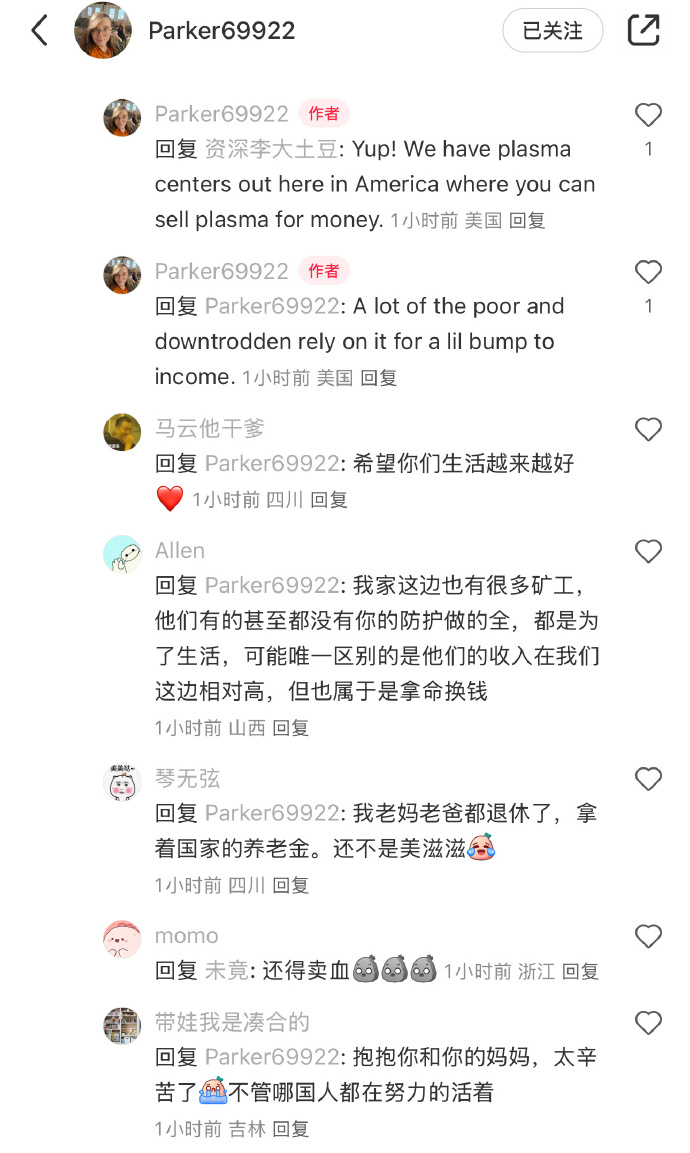 🔹“Yup! We have plasma centers out here in America where you can sell plasma for money(是的,美國有很多血漿中心,可以賣血漿賺錢)”