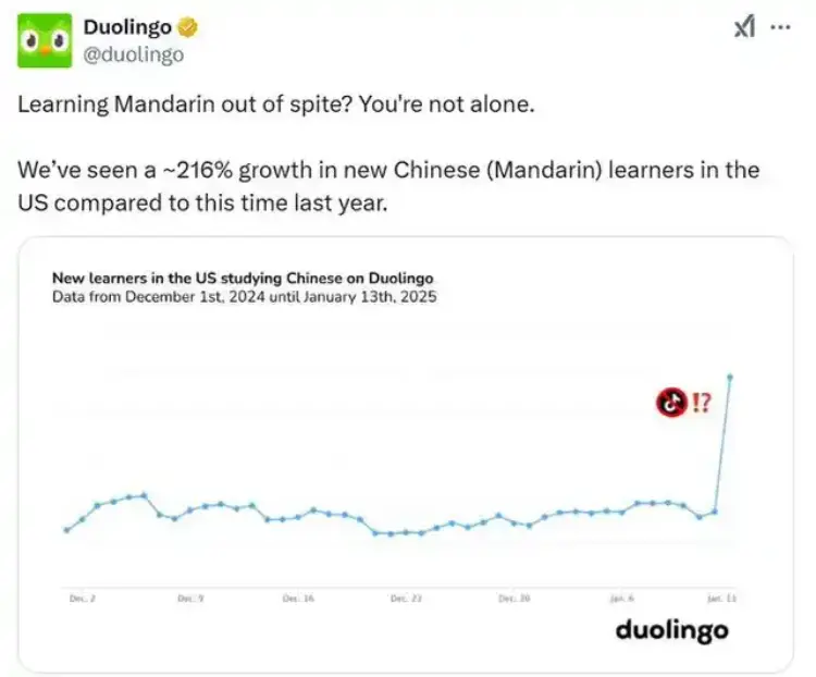 另外,許多美國人開始在多鄰國(Duolingo)上學習中文。多鄰國是美國的一款語言學習網站兼應用程序,其運營商表示,學習中文課程的用户數量與去年同期相比增長了216%。今年1月,隨着越來越多的美國人開始使用小紅書,不少人也同時註冊了多鄰國。