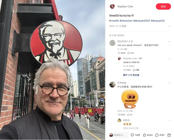 受寵若驚的感覺讓他們對中國產生了更為濃厚的興趣。一些人甚至摸索出“套路”,學習如何更好迎合中國網友的口味,以獲取更多關注。早一批進駐小紅書的美國人早早把“V我50”等網絡熱梗拿捏,輕鬆博得滿堂彩。