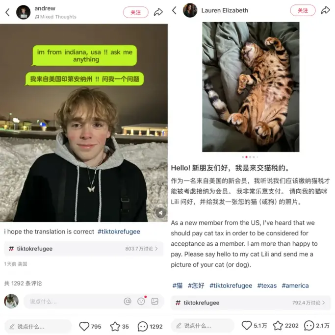 流量襲來,也悄然改變着小紅書的生態。美國內容創作者們對中國市場充滿了好奇和期待。有人表示,自己在小紅書一天漲的粉絲比在TikTok一年還多,他們發現,只要在中國社交媒體上強調自己是“TikTok難民”,就能輕鬆收穫正向反饋:評論、點贊、關注、流量如潮水般湧來。