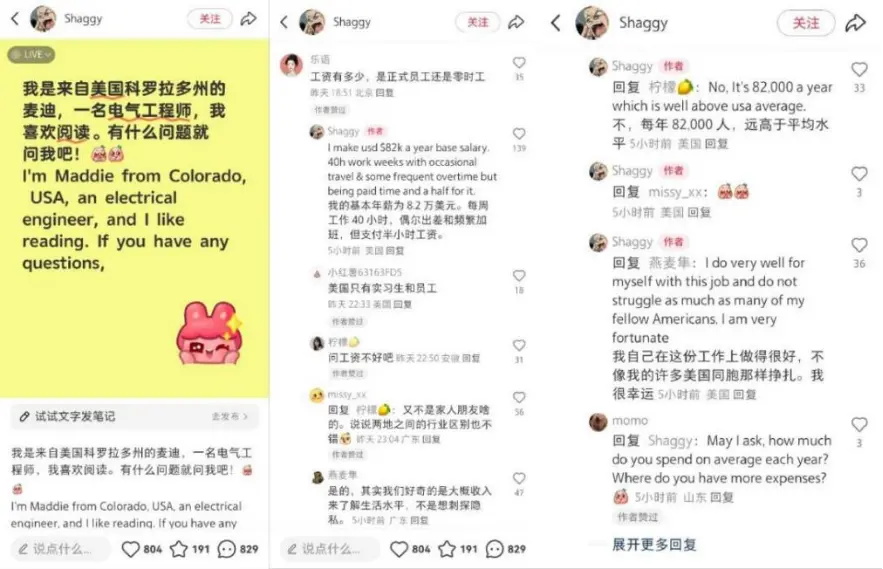 新註冊小紅書的美國網友Shaggy是一名來自科羅拉多州的電氣工程師,她發帖表示願意回答中國網友們感興趣的問題。
