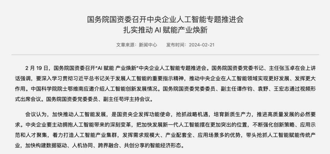 政策端也在積極引導,鼓勵央國企積極擁抱人工智能產業變革。去年 2 月,國務院國資委專門召開中央企業人工智能專題推進會,要求中央企業加快佈局和發展人工智能產業。10 家中央企業在會上簽訂倡議書,表示將主動向社會開放人工智能應用場景。