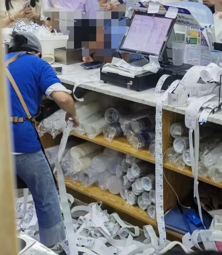 有時候,由於聯名上新、優惠促銷等活動,飲品店短時間迎來爆單,雖然經營者喜聞樂見,但面對堆成山的小票,許多店員不得不在服務和效率之間做出選擇。