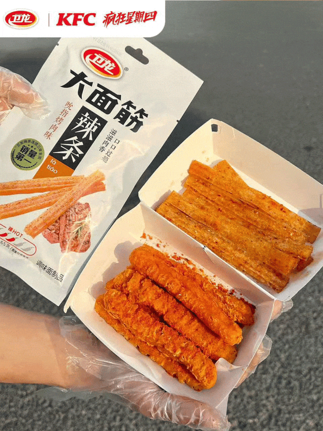 一直以來,“瘋狂星期四”都是全網年輕人的玩梗聖地,每到週四發“V我50”的衍生梗就會滲透到各種社交平台。最近兩週衞龍又貢獻了新的玩梗素材,它和肯德基組成“瘋搭子”。消費者只要去指定聯名主題店點辣條風味大雞肉條,就能獲贈一份吮指烤肉味辣條。