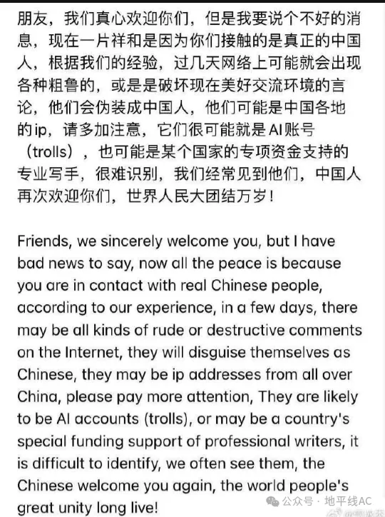 而他們現在在小紅書的發言通常都會自己翻譯成中文然後給中國網民看。中美網民發現大家其實都可以做朋友的,這不正是教員所説的“世界人民大團結”嗎?這個世界人民當然也包括美國人民。