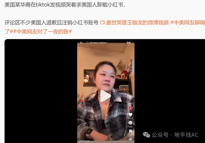更有甚者像下面這種,她裝哭説如果美國人不卸載小紅書的話,像她這樣的海外華人就沒法用小紅書了。因為小紅書會被迫做IP隔離。她以此為由騙美國人卸載小紅書,一些本來就心軟的美國人真的信了。目前這個視頻幾十萬點贊,估計全網瀏覽量有數千萬。