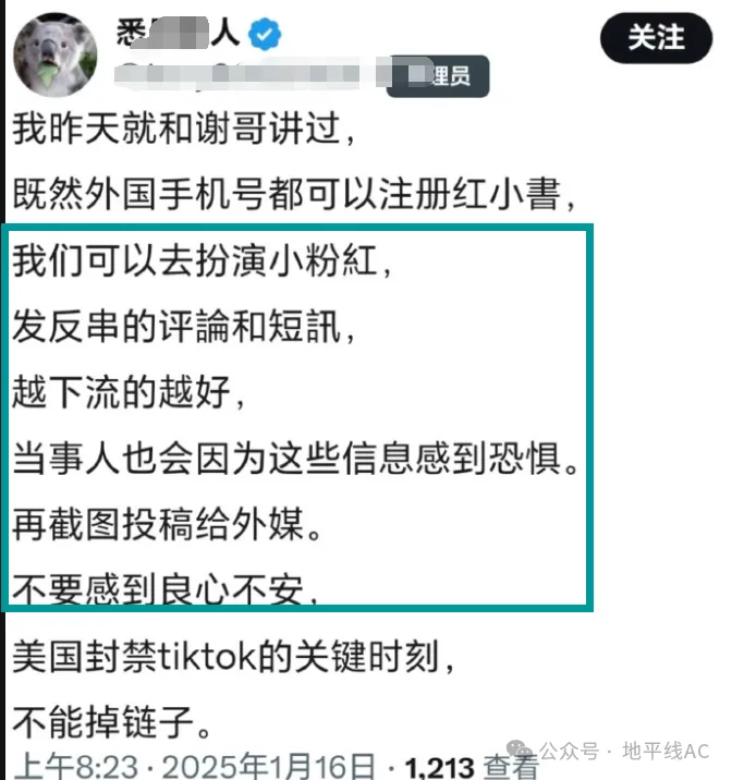 例如下圖這種他在羣裏號召他的粉絲去反串發表負面言論然後截圖給美國人“告洋狀”,讓美國人把小紅書也封了。同時也讓美國人對於跟中國網民交流持負面態度。