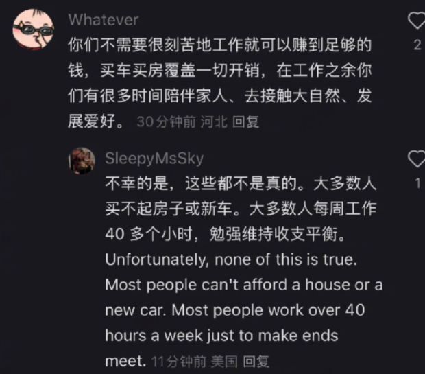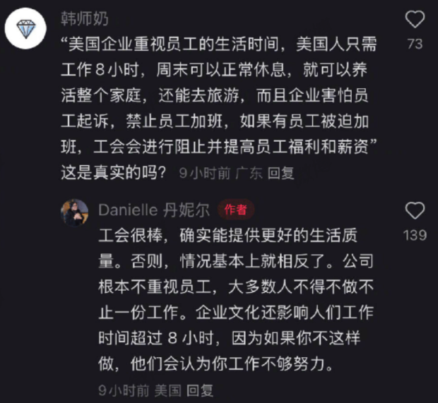 他們第一次知道,中國人都在吐槽的996,其實只有大公司高收入羣體才有,這些人中午休息時間兩小時,吃飯都在公司食堂,也不需要再幹別的工作;而美國人一般都需要“靈活就業”,打兩到三份工,才能養活自己,他們是496,很多人早上四點鐘就開始工作,一天干十幾個小時,一週幹六天。美國資本家太聰明瞭,他們會故意把一份工作限制在8小時之內,這樣就需要交完整的醫保了,工資也不用給足,員工則可以再去找兩份工作……這樣員工“工作很飽和”,老闆“人力成本很低”,美國政府“就業數據很好看,屢創新高”……三贏,贏麻了。