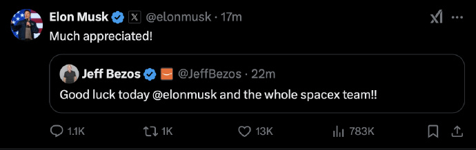 而更搞笑的是,就在發射之前,貝索斯還給馬斯克加油打氣,想着哥倆的火箭都能一次成功;最後跟星艦一比,這倆貨一個炸了頭,一個炸了屁股,倒也算是難兄難弟。