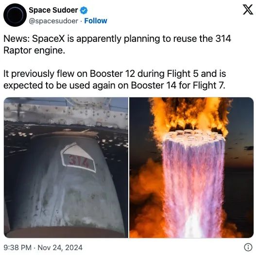 而 V2.5 也算是久經沙場了,甚至能重複使用。有網友發現,這次的助推器 B14 上就有一台代號 314 的發動機,跟之前第五次發射的是同一個。