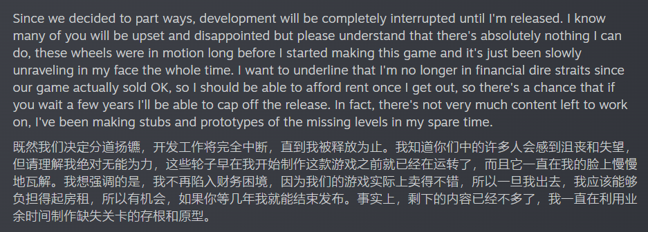 “我想強調的是,我已脱離財務困境,因為我們的遊戲賣得還算不錯,所以一旦我被放出來,我應該能負擔得起房租,如果你們能再等個幾年,我或許就能完成遊戲的正式發佈。事實上,剩下的內容已經不多了,我一直在利用空閒時間製作剩餘關卡的雛形和原型。”