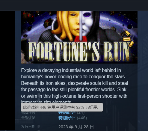 2023年9月,一款名為《Fortune’s Run》的復古風FPS遊戲以搶先體驗的形式登錄了Steam平台。該作的熱度與銷量表現平平,但玩家口碑還算穩定,科幻風格的氛圍搭建和各種趣味性十足的交互細節都十分用心。目前遊戲在Steam的好評率維持在92%,大部分玩家都認可了本作的快節奏近戰射擊遊戲體驗。