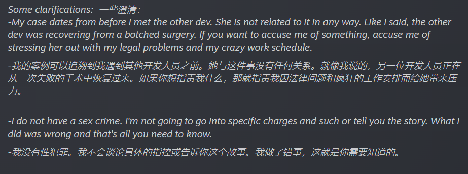 “《Fortune’s Run》開發者落網”的消息傳開後,玩家們毫無根據的猜測便也接踵而至。為了回應玩家們的質疑,Dizzie出面澄清了兩條基本事實。他説案件發生於自己與妻子相遇之前,她與這件事毫無關係,以及自己沒有犯下性犯罪,他也不想進一步討論案件的更多細節。