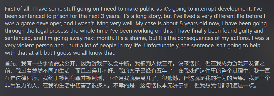 Dizzie在成為遊戲開發者之前過着截然不同的生活,而且過得並不好——他在公告中表示:“我的案子已經有五年了,在我從事這項工作的過程中,我一直在走法律程序。現在我終於被判有罪,下個月我就要離開了。”
