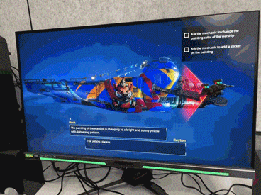 找到搭載了NVIDIA ACE的對應NPC,玩家就可以通過語音或文字指令,任意改變飛船的塗裝顏色和標誌圖案。或者是用簡筆畫簡單勾出一個機械部件的外形,AI就能做出對應的組件給玩家。