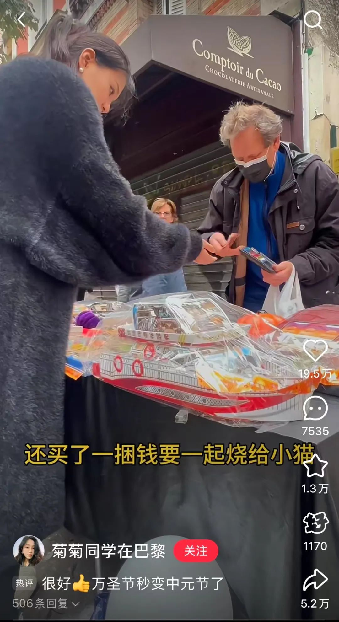 萬聖節前夕,中國網友在法國街頭擺攤的視頻火了。