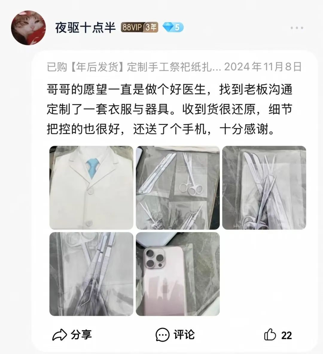 比如有人通過定製醫生白大褂和工具紙紮品,幫哥哥實現做醫生的願望。