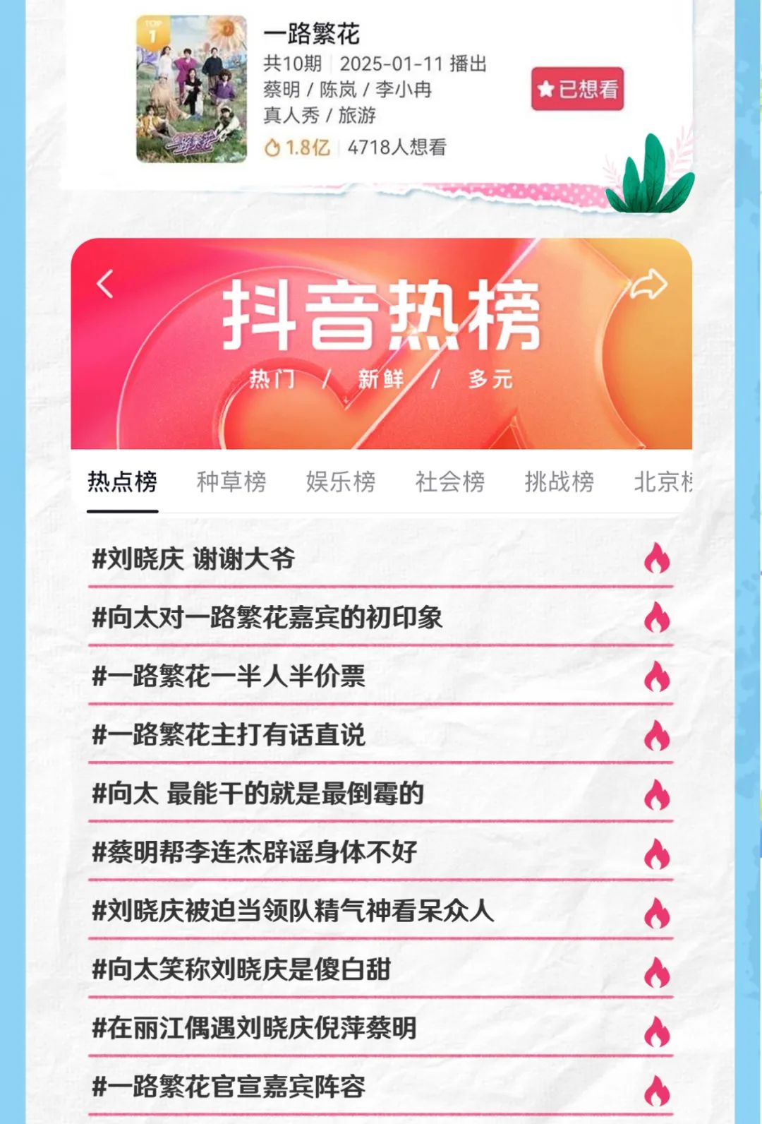 然而,1月11日,當《一路繁花》在愛奇藝播出一期後,社交媒體上的話題直接拉爆,二創切條在各平台刷屏,登上多個熱搜榜單。網友們紛紛表示,誰會想到一個平均年齡60歲+的姐姐旅行團,竟成了2025年綜藝“開年第一爆”?