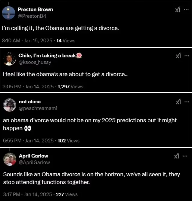 網友“Preston Brown”在X上寫道,“我要説的是,奧巴馬伕婦要離婚了。”