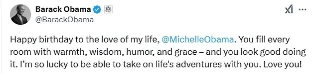 當地時間週五,前總統奧巴馬在社交媒體公開示愛,他寫道:“祝我一生摯愛@MichelleObama 生日快樂”,並附上一張他們手牽手享用晚餐的照片。