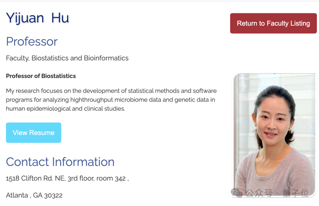 官網顯示,她專注於生物信息學、遺傳關聯研究、微生物組研究,重點是開發用於分析人類流行病學和臨牀研究中的高通量微生物組數據和遺傳數據的統計方法和軟件程序。