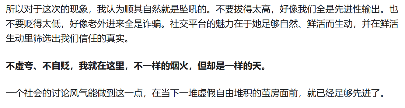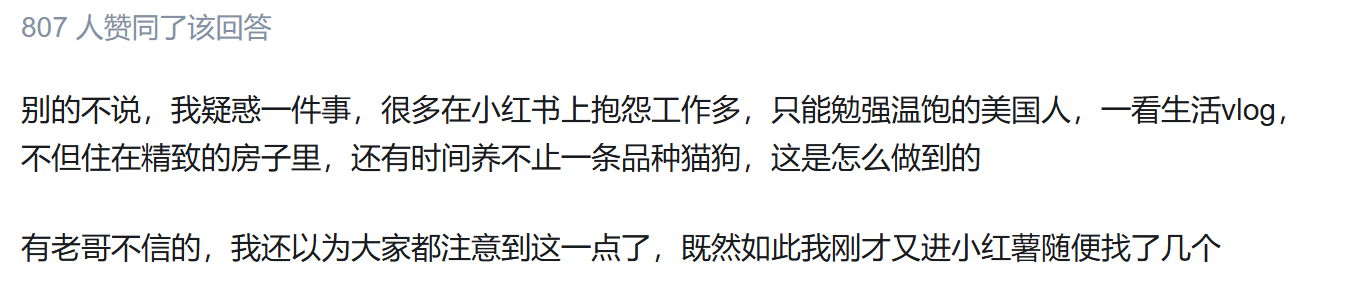 譬如有人舉出老外渲染自稱打兩份工,打開一看還能養着貓貓狗狗、騎行度假,肯定是在誆騙咱鱉的。