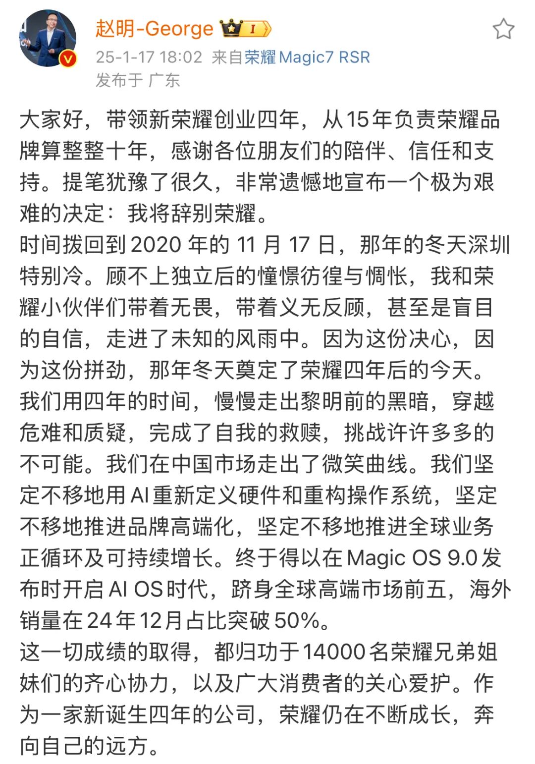 在發佈離職長文之前,趙明的上一條微博停留在1月12日,他只是轉發了一條為榮耀Magic7影像宣傳的微博,轉發文案也很簡單,“極致、純粹之美”。