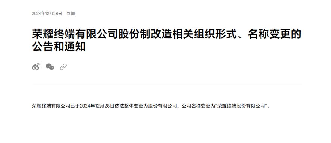 其一就是去年12月28日,榮耀發佈公告,宣佈股改已完成,榮耀終端有限公司已於2024年12月28日依法整體變更為股份有限公司,公司名稱變更為“榮耀終端股份有限公司”。