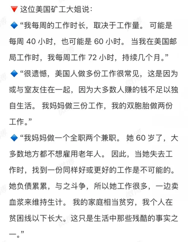 這幾天中美網友在小紅書對賬,在擺脱了殖人高華中介信息二道販子等等的信息污染,兩國網民直接進行交流後,不少對賬結果讓人大跌眼鏡。其中一則引發廣泛討論的信息是一位美國女礦工(是的,在美國女性也從事井下勞動)自述,她的60歲母親要做一份全職兩份兼職工作維持生計,還要賣血漿。