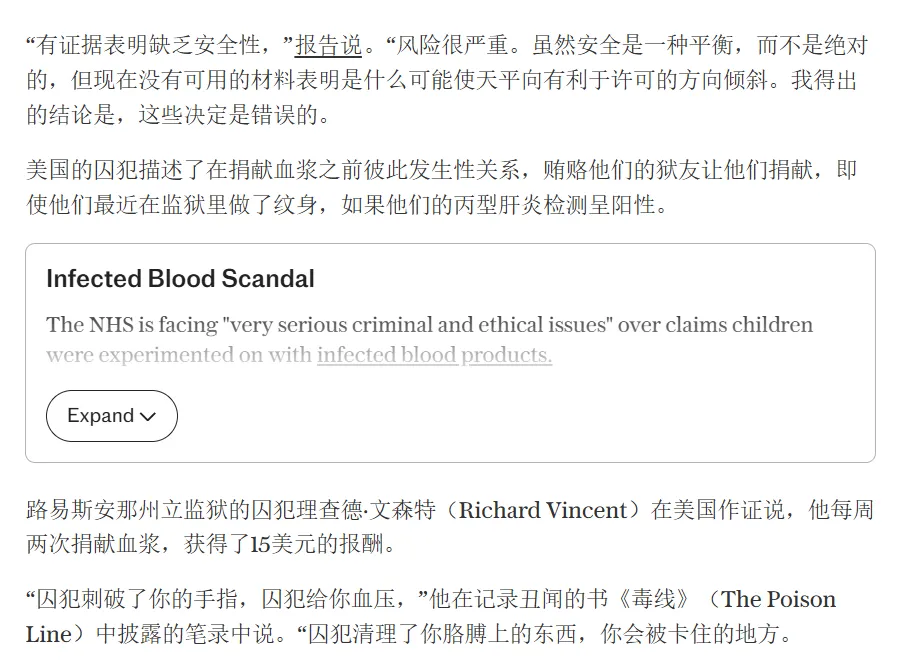 至於進步了的檢測技術,只怕是成了某些公司逃避問題的理由。**“反正這些人如果有什麼問題,總能檢測出來的,何必要篩選呢?”**有錢人也不用擔心健康問題,還記得筆者提到過的富豪們喜歡的“輸血抗衰老”技術嗎?這些富豪用的血液,自然是來自於各方面都很健康的年輕人,還有遠比血液中心更詳細的檢查流程,出賣血液的金額也更高。不得不説,這實在是太資本主義了,你只要付得起,總是會有些不一樣的服務的。