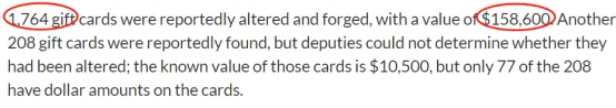 警方在調查中查獲了超過7000張被篡改的禮品卡,扣押了2輛汽車,並發現一間酒店被用作禮品卡篡改和運輸的地點,而這四人人均為中國公民,過去18個月內曾從中美洲通過美國南部邊境非法入境。