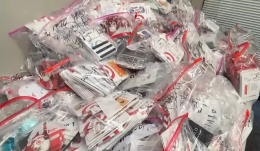 這些禮品卡多來自 Target、Prepaid Visa、American Express、Macy’s 和 Apple 等品牌,許多卡片有明顯改動痕跡,數字被劃、磁條損壞,掃描時編碼與打印數字不符。
