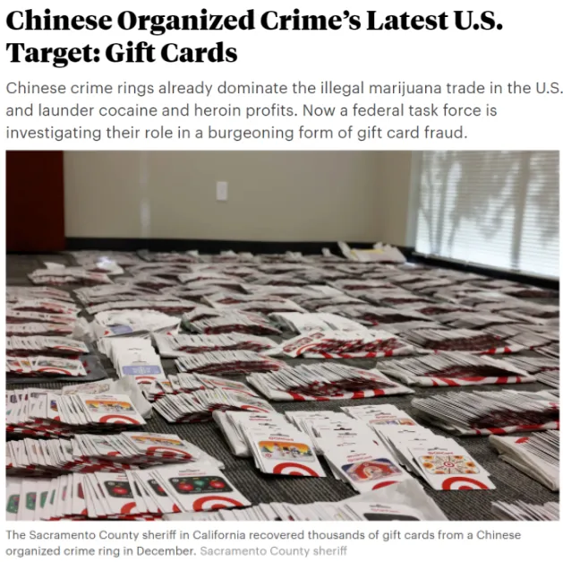 近年來,美國境內的“禮品卡詐騙”案件非常嚴重,其中許多案件都與華裔犯罪團伙有關,為此,美國國土安全部還專門啓動了一個名為“紅鈎計劃”的專項行動。