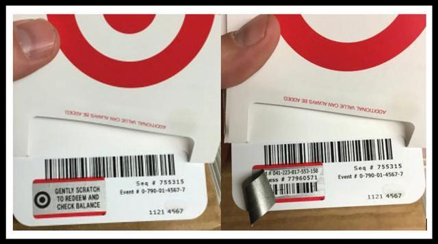 ▲篡改禮品卡信息的方式有很多種,高端點的是用機器篡改後重新貼上塗層,低端點的直接就是覆蓋一個同樣大小的貼紙。