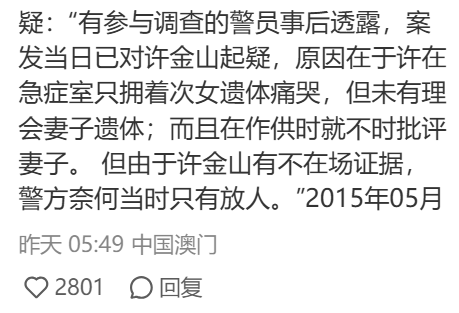 其實有警員案發當日已對許金山起疑,原因在於許金山在急症室只擁着女兒的遺體痛哭,但未有理會妻子遺體;而且在作供時就不時批評妻子。