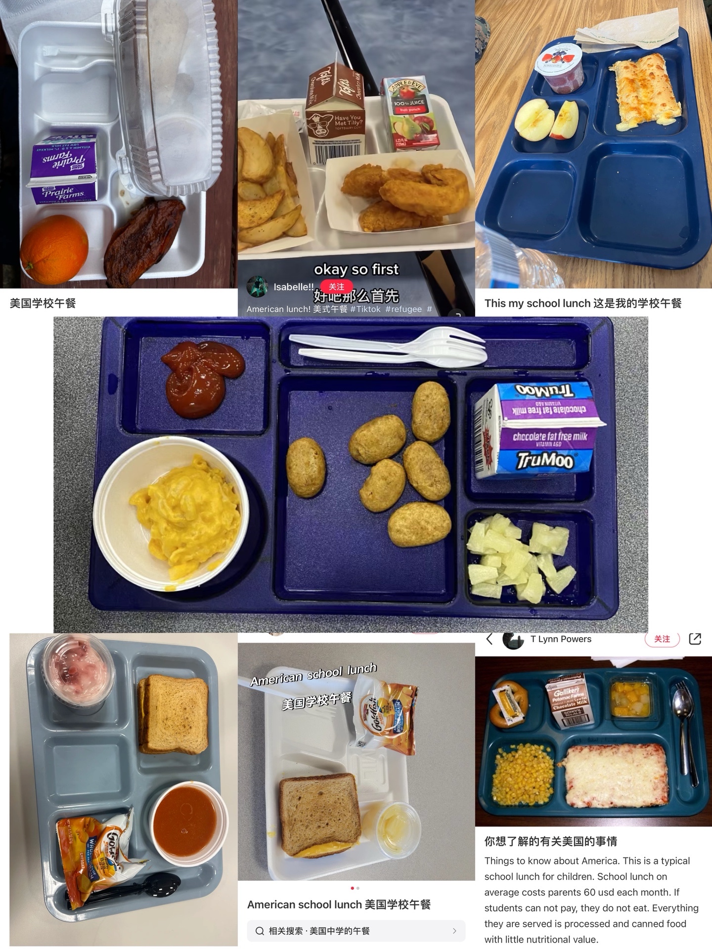 隨後我去找了幾個美國人曬學校午餐的帖子和視頻,為了確保真實性特地找了一些美國高中生曬學校午餐的視頻以及照片。