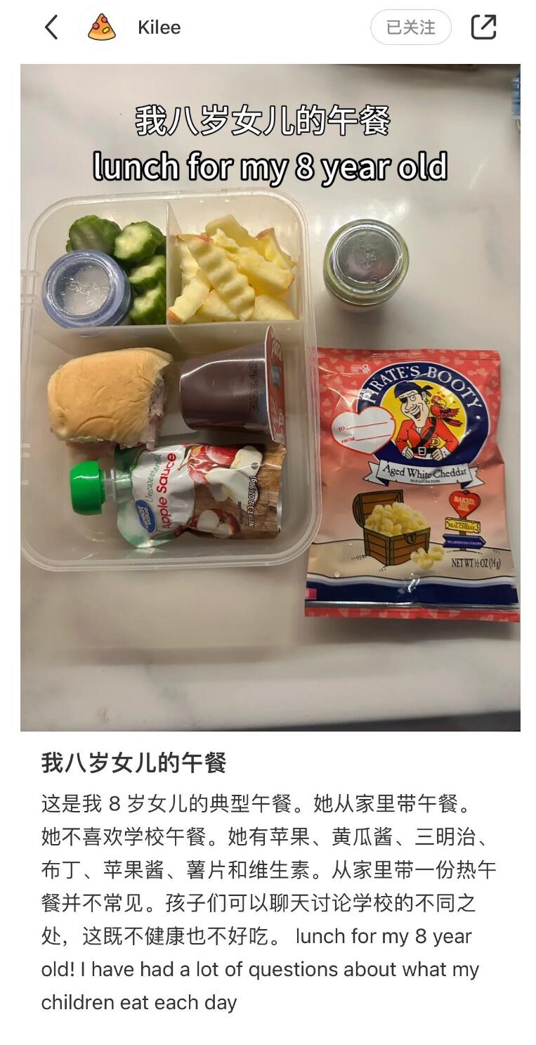 而昨天關注的一個三胎寶媽發了給自己八歲女兒準備的學校午餐。先説一下,這個三胎寶媽在美國算是中產階級家庭了,她和老公都有全職工作,收入還算令人滿意,住的也是獨棟大house。雖然緊巴巴但足夠支付賬單,所以不存在錢不夠的問題。