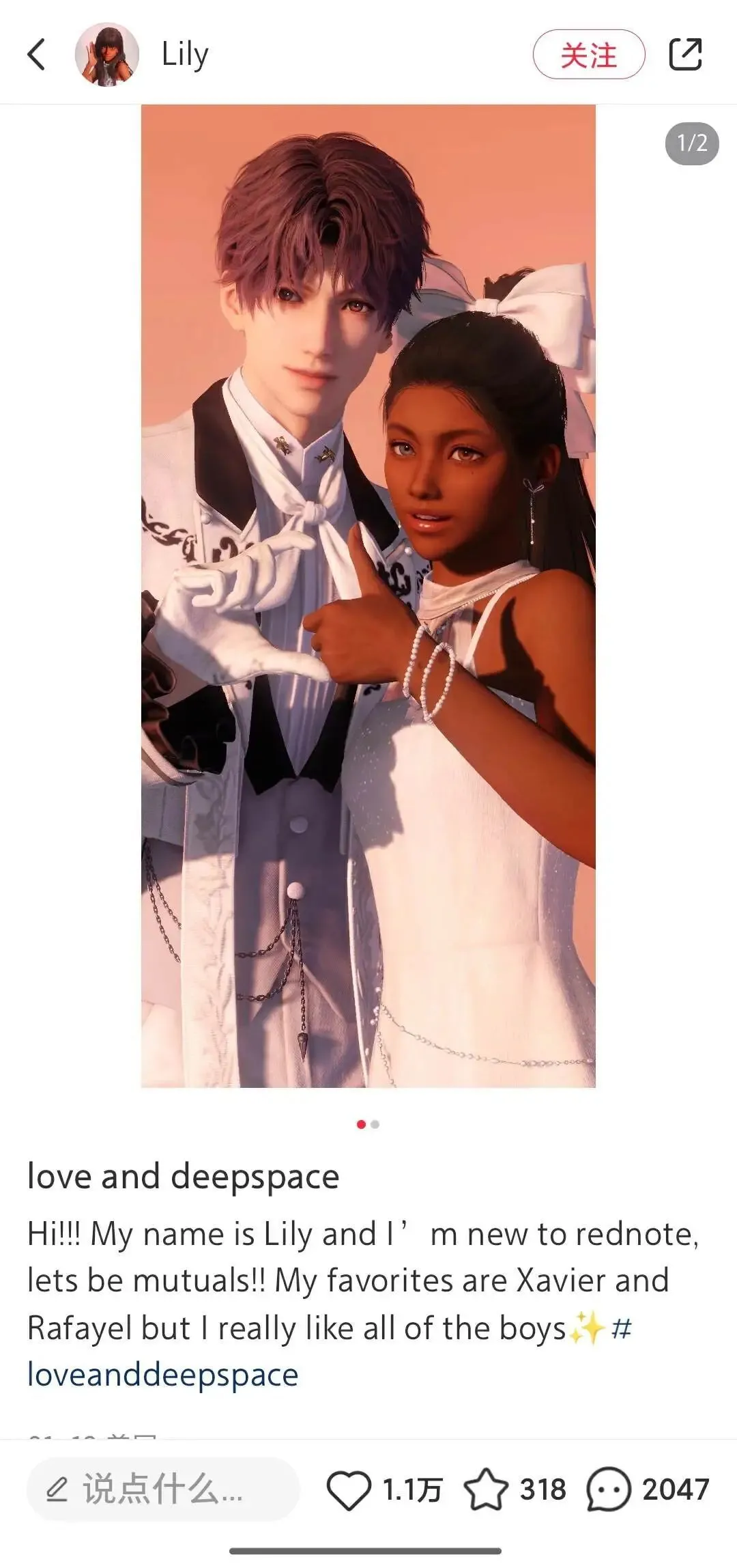 Lily 是一個 26 歲的美國女生,同樣是聽聞 TikTok 即將被禁的消息後來到小紅書。她喜歡玩一款中國的乙遊——《戀與深空》,當她發佈了在遊戲中的圖片後,迅速彙集了眾多玩家與她一起討論——因此在她看來,小紅書上有她想要的一切。