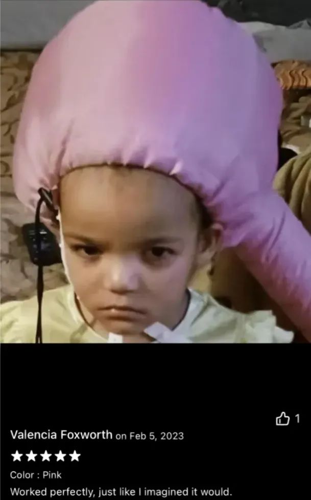 比如這個輔助吹頭髮的幹頭套,買家自己不出鏡,硬控家裏小孩在鏡頭面前試用,結尾來了個五星好評。
