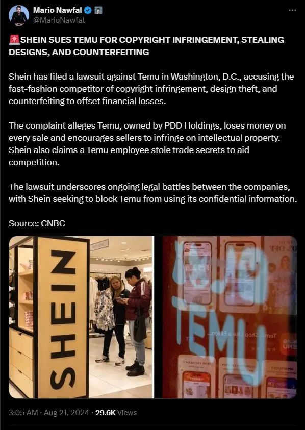 很多海外賣家也多次指控過TEMU產品設計抄襲,甚至國內出海同行SHEIN都曾起訴過TEMU。