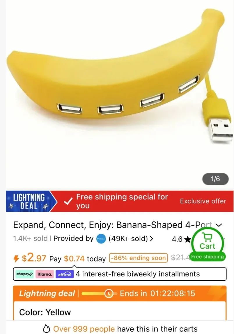 你以為是香蕉,結果是USB拓展塢,功能上看,確實比孫宇晨4500萬拍得的“藝術膠帶香蕉”有性價比。