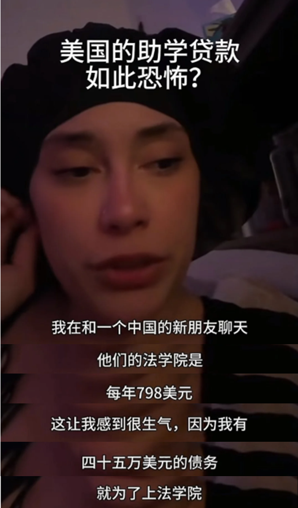 一個美國網友,唸了個法學院,竟然欠下了45萬美元的高額債務。人還沒參加工作呢,光是拿到一張畢業證,就欠下了45萬美元了,摺合人民幣329萬。而中國人讀法學院,4年全部讀完,學費也才五六千美元而已。中美學費幾乎差了100倍!